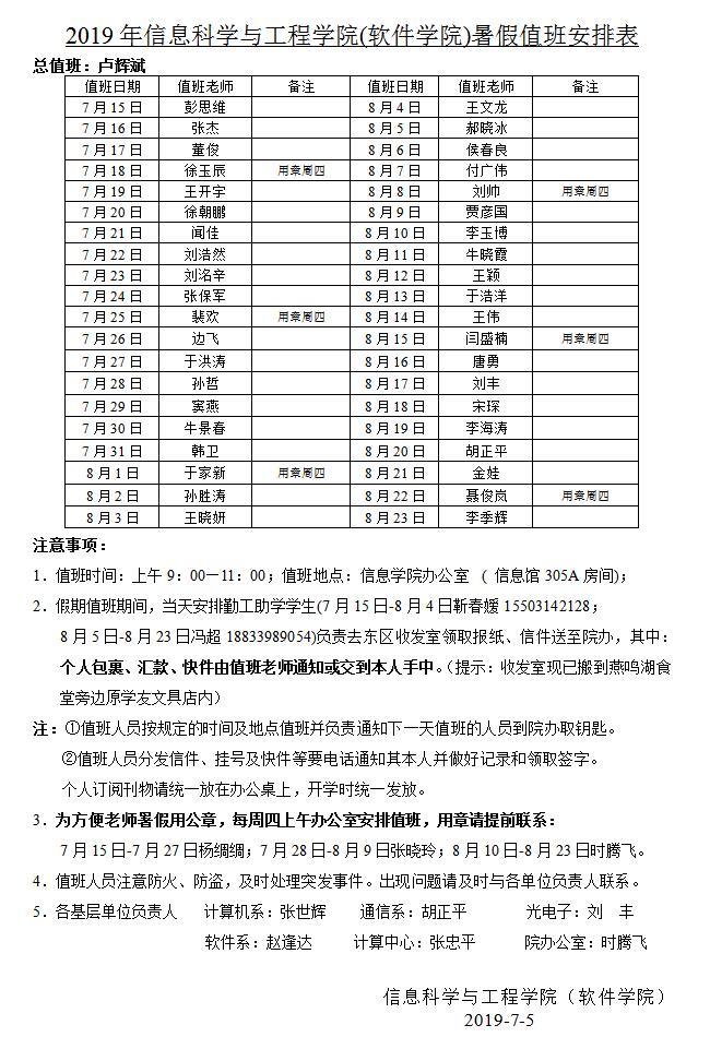 永利集团304am登录2019年暑假值班安排表