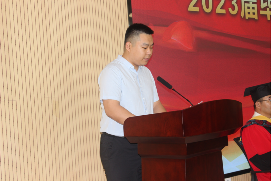 光电子系青年教师刘宇韬代表全体教师发言,他对2023届本科毕业生圆满完成学业表示衷心的祝贺,并希望全体毕业生终身学习,不断提高;勤奋努力,砥砺前行;积极乐观,笑面人生。