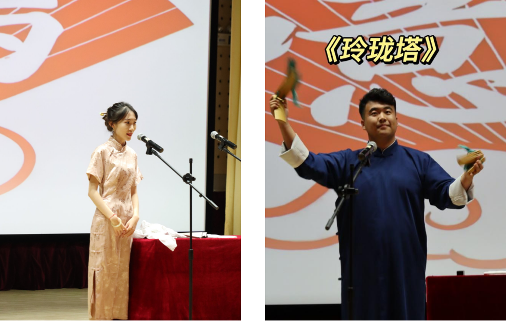 演出在主持人董思睿同学幽默的开场词中开始。相声社板师祖健亮同学表演了传统快板《玲珑塔》,吐字清晰、口齿伶俐,引来现场观众一片叫好。