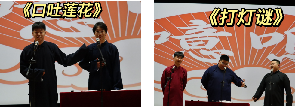 刘子瑞和钱宇斌的《口吐莲花》,以娴熟的表演调动了全场的氛围,夺得一片喝彩。钱新宇和孔德赛这对相声社的老搭档带来了节目《智取威虎山》,形象的演技,魔性的声音,引得台下掌声不断。于兴达、张晟宇作为相声社的“老师傅”,表演了《百家讲坛》,故事娓娓道来,使全场气氛达到高潮。社员樊林志、刘屹然作为2023届毕业生,带来了《学跳舞》,《打灯谜》,《拴娃娃》三个节目,其中《打灯谜》这段群口相声更是由刘伟,刘紫豪,刘国庆,刘岐,梁智超几位新老演员合作出演。