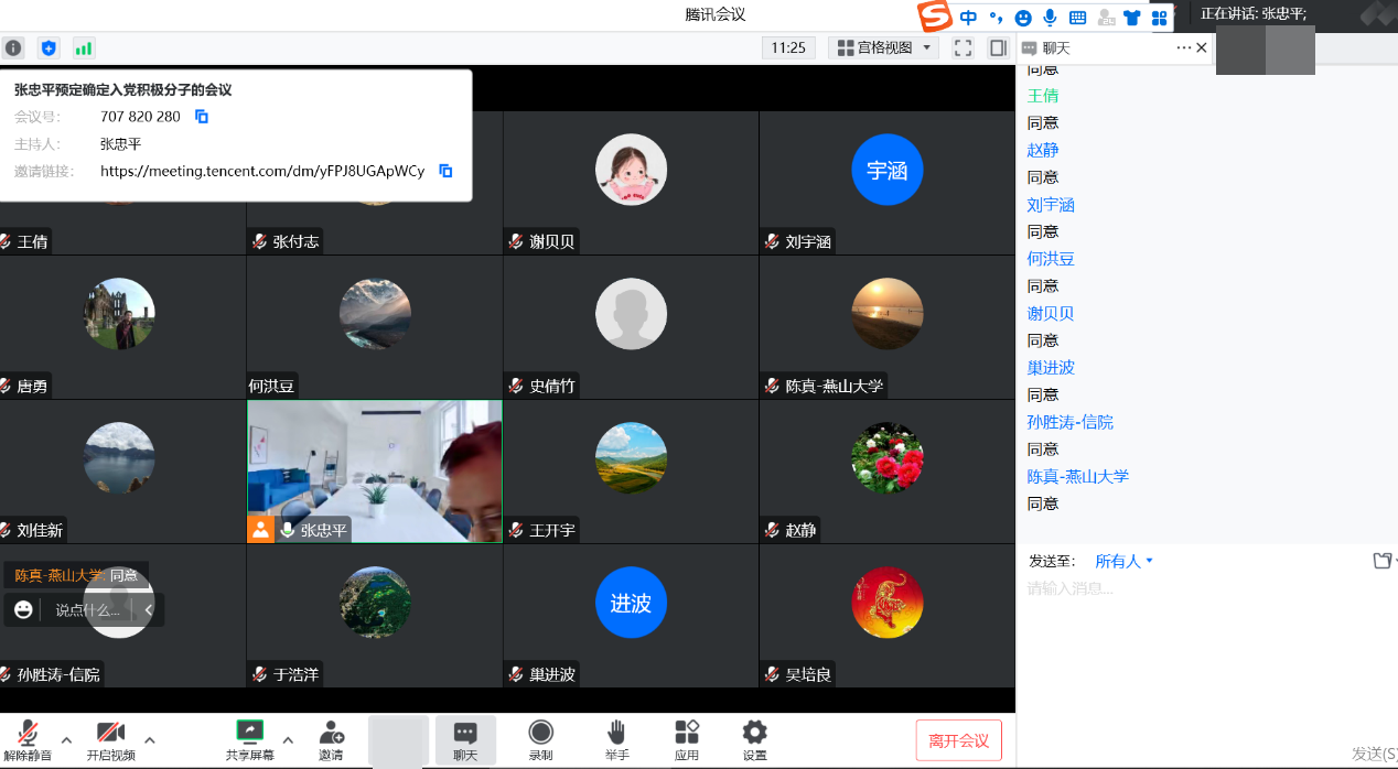 最后,因为线上会议高峰期限制摄像头的开启数量,党员同志们在线文字表决,一致同意杜国栋和郜山权两位青年教师被确立为入党积极分子。