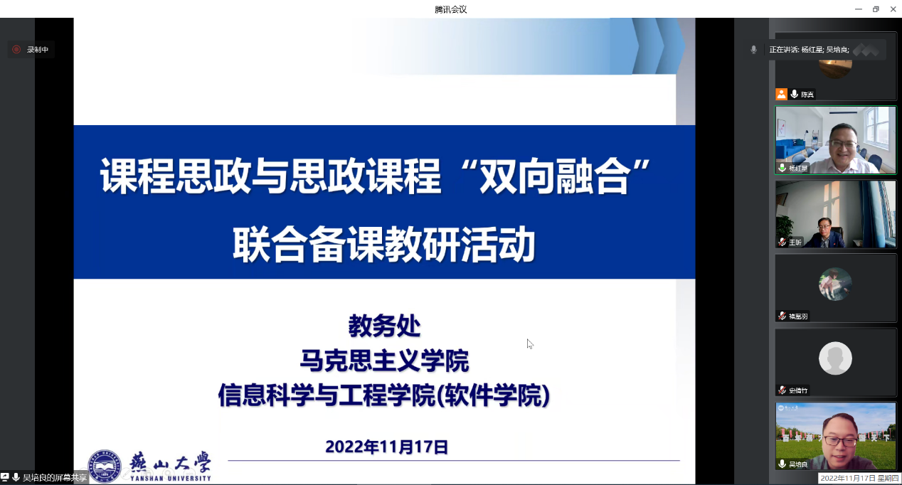 11月17日下午,永利集团304am登录计算机科学与工程系与马克思主义公司习近平新时代中国特色社会主义思想概论教研部开展课程思政与思政课程“双向融合”联合备课活动。信息科学与工程公司党委书记王昕,教务处副处长赵逢达出席会议活动,计算机科学与工程系全体教师参加会议,马克思主义公司杨红星、褚凰羽、李雪莲等8位老师点评课程思政设计环节。