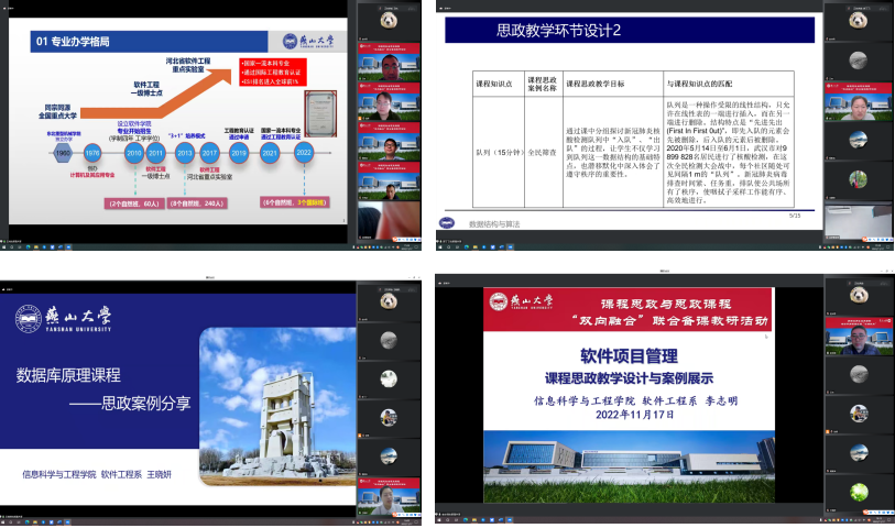活动中,我系教师郭丁丁分享了《数据结构与算法》课程中多个思政实例,并对利用有向图分析新冠密接排查的案例进行详细解说。王晓妍老师对《数据库原理》课程中在知识点“关系模型”上的“祖国大好河山”实例和知识点“数据库管理系统的主要功能”上的“警惕网络诈骗”实例做了具体讲解。李志明老师提出教师应深入理解课程思政目的,合理选择知识点将思政内容融入课堂,结合方舱医院建设过程详细解说《软件项目管理》课程“组织文化”课程思政实例。