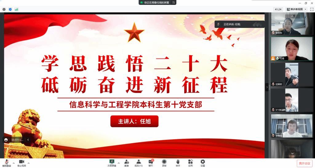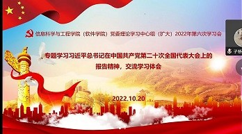 党的二十大,开启了全党全国各族人民全面建设社会主义现代化国家的新征程。信息科学与工程公司党委将广泛开展新闻宣传、专题学习,更好推动党的二十大精神进支部、进班级、进课堂,在全院迅速兴起学习宣传贯彻党的二十大精神的热潮,让正能量更强劲、让主旋律更高昂。带领广大师生坚定捍卫“两个确立”、坚决做到“两个维护”,进一步激发广大师生踔厉奋发、勇毅前行、团结奋斗的精气神,汇聚扛起“争当表率、争做示范、走在前列”的光荣使命的磅礴力量。在新时代立德树人的征程中,不断奋进,勇立新功。