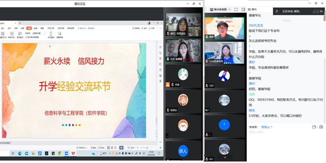 参会的2019级、2020级本科生们踊跃提问,比如申请保研是否看重学科竞赛经历、专硕和学硕的区别、如何选择院校等,学长学姐们结合自身经验给予了详尽细致的解答,鼓励学弟学妹们要保持良好心态,坚定升学深造的信心。大家热烈探讨,充分交流,参会同学们从学长学姐分享的经验中受益良多。