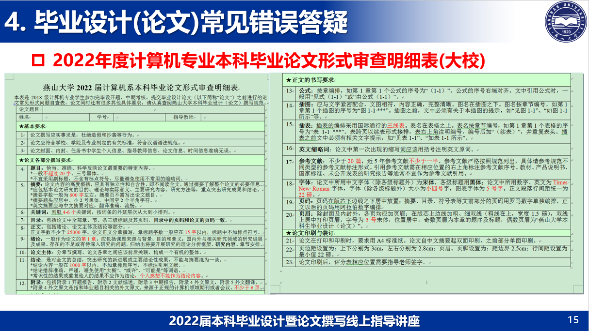 计算机科学与技术专业在往年毕业设计常见问题的基础上,制定了《304永利集团官网入口2022届计算机系本科毕业论文形式审查明细表》。陈老师通过实例分析,详细向毕业生解读了毕业论文写作的基本要求,论文各部分撰写方法,正文公式插图、插表、英文缩略词、参考文献、字体、页码和页眉的书写规范以及论文印刷与装订过程中的注意事项等等。陈老师还向同学们展示了往届的优秀毕业设计。最后,员工们积极踊跃提问,陈老师耐心回答了员工们在做毕业设计和撰写毕业论文过程中可能遇到的问题。