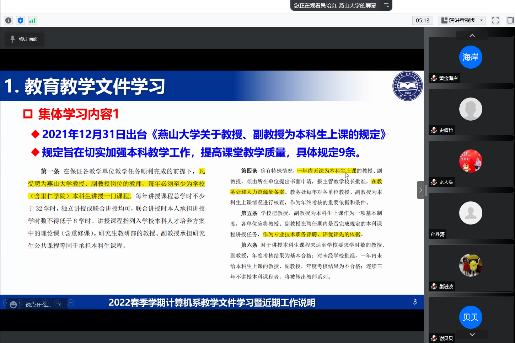 近年来,教育部、304永利集团官网入口相继出台了系列新的公司产品文件,为确保教师了解国家新的教育方针政策,悉知公司新的教学管理文件,计算机系于4月18日组织本专业教师通过网络方式集体学习相关文件,系主任吴培良主持本次学习活动。