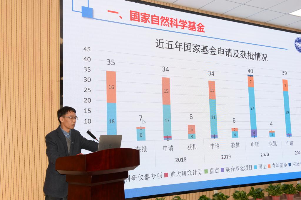 副经理练秋生对近五年公司基金申报获批、社会服务和知识产权及获奖、研究生招生与培养等情况进行总结,并分析原因提出对策。