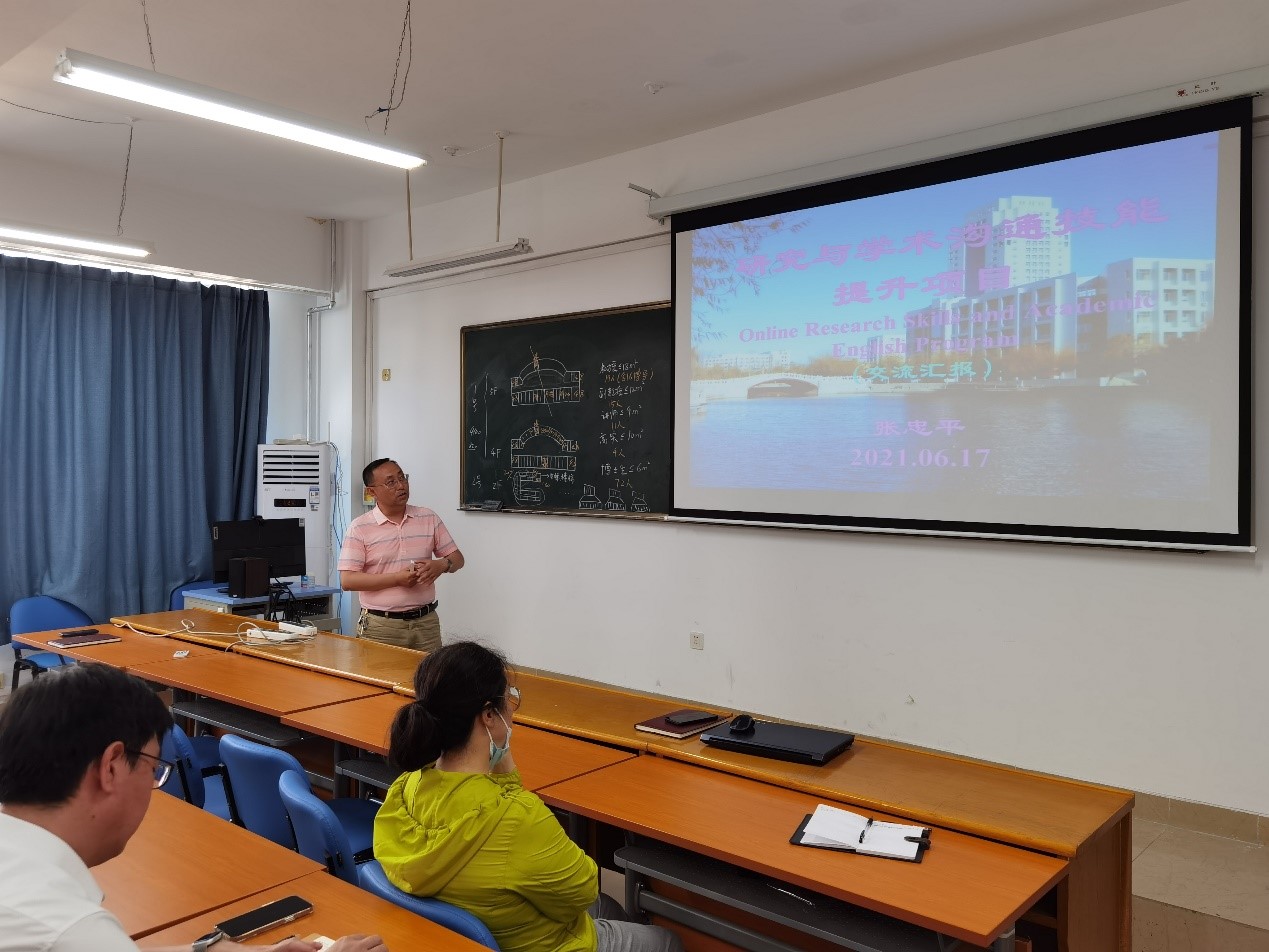 该项目的课程通过Zoom在线视频会议平台进行,计算机系党支部书记张忠平作为该项目的优秀学员,和大家分享了学习过程与学习成果。首先,张忠平教授介绍了该项目的主旨为:提高高校教师的学术英语水平,进一步加强学术沟通和写作技能,从而更加有效地参与各项国际学术交流活动。