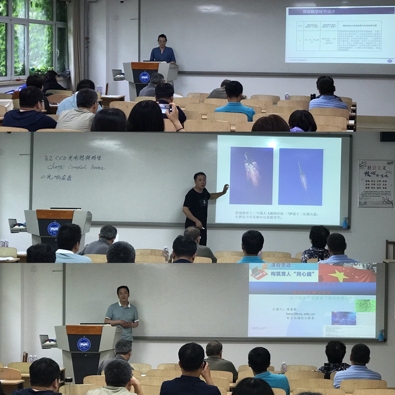 竞赛现场,各参赛教师分别按照教学设计内容进行了15分钟左右的教学展示。参赛教师从自己的学科特点出发,深入挖掘课程蕴含的思想政治教育元素和所承载的思想政治教育功能,使各类课程与思想政治理论课程同向同行,实现“知识传授”和“价值引领”有机统一,展示了各自的教学风采和理论功底。