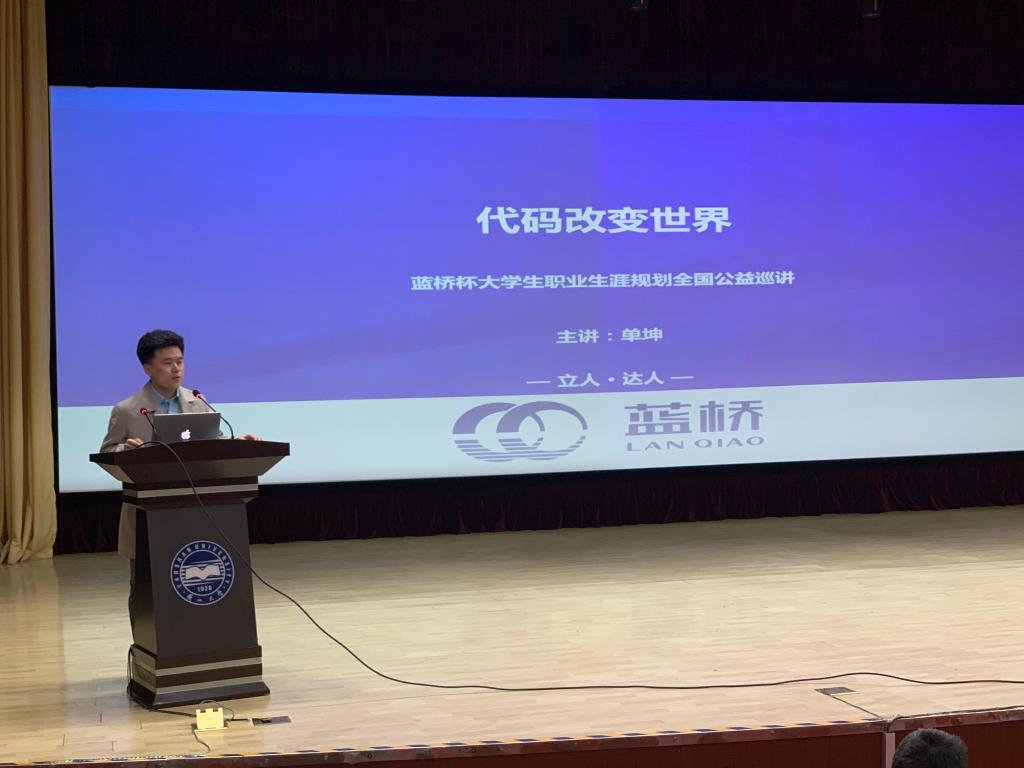 4月15日下午,软件工程专业在西校区老员工活动中心报告厅举办了题为“代码改变世界”老员工职业规划的讲座。本次讲座邀请“蓝桥杯”组委会高校联络部副主任单坤老师担任主讲,公司党委副书记苏静、软件工程系领导和教师代表出席,18级软件工程专业两百余名同学参加。