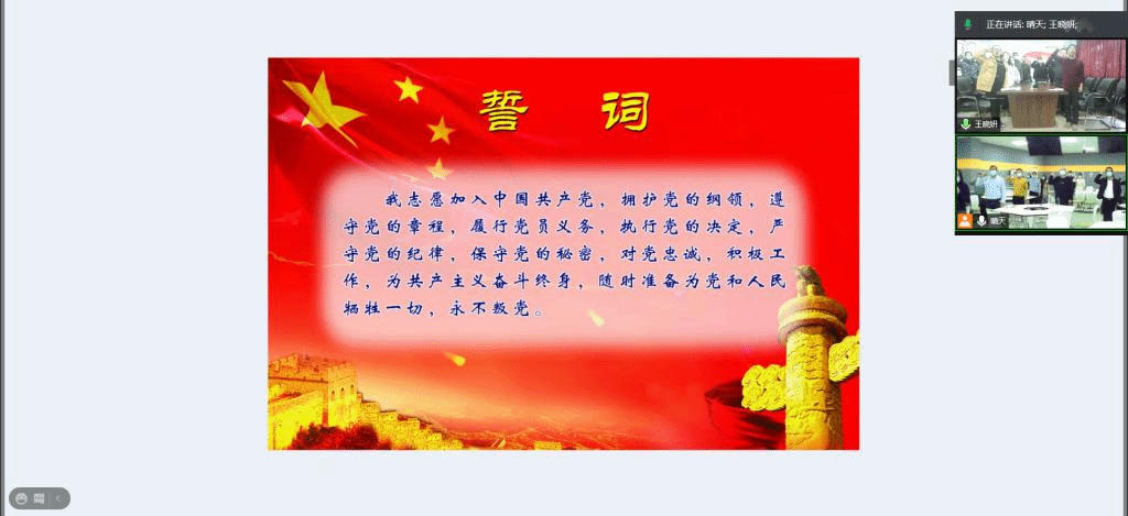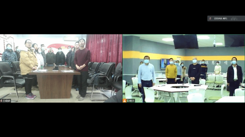 主题党日活动在庄严的国歌声中开始。冯建周介绍了联合主题党日的筹备过程和活动主旨。新疆科技公司团委书记、工科公司党总支书记赵一佳领誓,双方全体党员在鲜艳的党旗下,相隔万里,重温入党誓词,并跨越万里间隔合影留念。