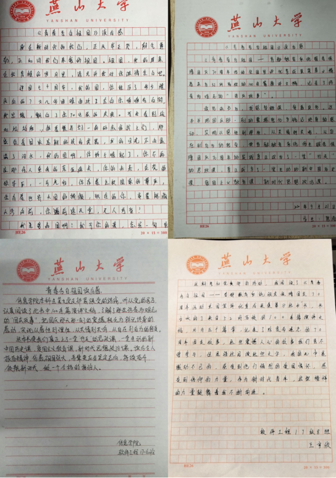任仁写到:身在新时代的我们,正风华正茂,朝气蓬勃,正如同我们亲爱的祖国。祖国,我的母亲,在我青稚的岁月里,请允许我对你深情告白吧。中华人民共和国成立七十周年,我的国,你经历了多少腥风血雨?又几多困难曲折?在向你喃喃告白时,我思绪,飘向了你70生辰的庆典。当我看到站如松柏般,做着整齐划一的动作的战士们,那象征着国家高新科技的武器,我的目光不由盈满了泪水,我的国啊,你终于崛起了,你不再是那任人鱼肉的东亚病夫,你的未来,在党的领导下,一片光明,你有着主权国家的尊严,你有着世界大国的骄傲,现在的你,昂首挺胸,大步向前,你前途无量,无人可当!我亲爱的国啊,我于你的爱,怎是一句告白可以诠释的,它存在于我灵魂的深处,生命的尽头,我将用生命守护!