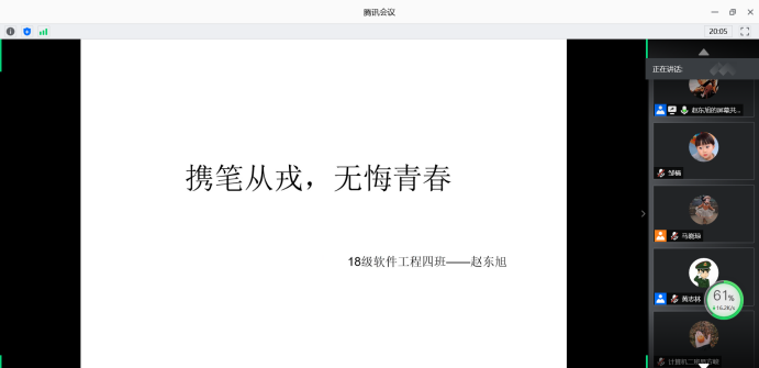 2018级软件工程1班黄志林、2018级软件工程4班赵东旭两位同学同学作为在校优秀退伍老员工,以自己的亲身经历和感悟给大家做了生动详实的分享。积极鼓励在校老员工到军营中锻炼自己,磨练意志。同时,两位同学同学结合自身参军入伍的经历介绍了兵役登记、预征报名、体检政审等应征过程中的注意事项。他们勉励同学们要关注老员工应征入伍相关工作,关注我国的国防事业,班级要营造“参军报国、无上光荣”的征兵氛围,在日常的学习中用自己的实际行动积极参与到中国梦、强军梦的具体行动中。会上,同学们就老员工参军入伍相关问题进行互动交流,气氛融洽。