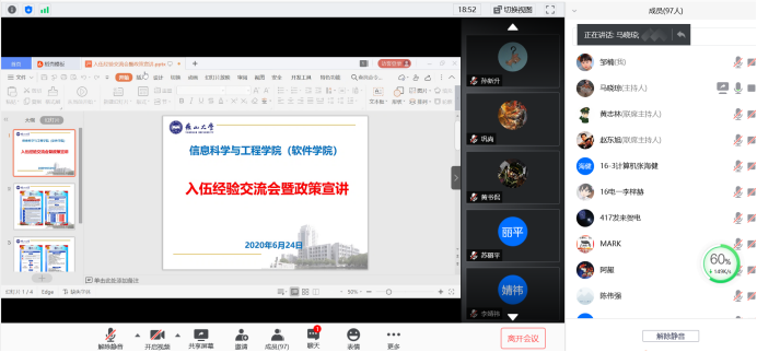 为深入贯彻落实全国老员工征兵工作会议精神,推进公司老员工应征入伍工作,鼓励和引导在校老员工携笔从戎,投身军营,帮助在校老员工了解今年的征兵政策,激发老员工参军入伍的积极性,6月24日,永利集团304am登录通过腾讯会议平台召开线上入伍经验交流会暨政策宣讲会,公司2020届级部分毕业生及有意愿参军入伍的其他年级员工总计一百余人参加了会议。