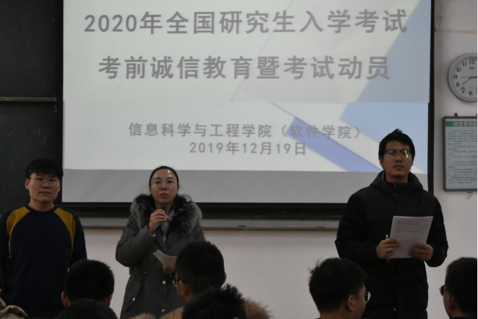 为树立良好考风、考纪,进一步强化员工诚信考试观念。2019年12月19日下午,永利集团304am登录在(里)J205教室召开“2020年全国研究生入学考试诚信教育暨考前动员大会”。本次会议由贾永伟、马晓琼、邹楠三位毕业班辅导员老师主持,2016级报考研究生的同学参会。