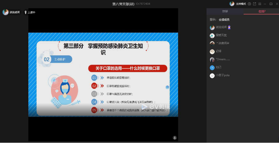 付庚宸同志以“返岗上班后怎么预防新型冠状病毒的感染”为题,从返港后工作区域的防护知识、新型冠状病毒相关知识解读以及掌握预防感染肺炎卫生知识三个角度为支部党员带来了一场知识普及讲座,在微党课的最后,表示要坚信在党的坚强领导下,我们一定能打赢这场疫情防控阻击战。