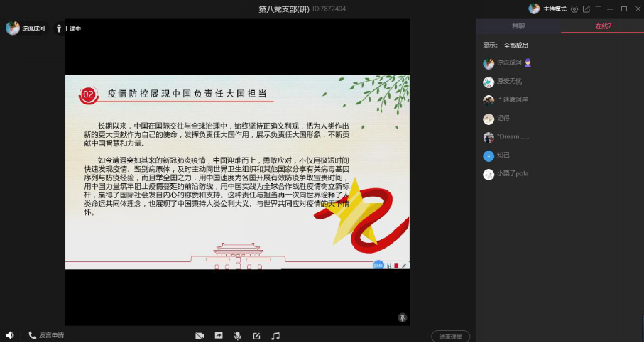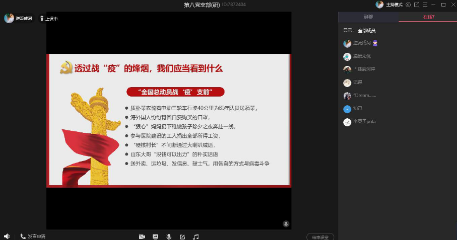 为深入贯彻习近平总书记关于疫情防控指示精神及党中央决策部署、积极发挥党员战斗堡垒和先锋模范作用,按照公司组织部《关于开展“尺笔丹心、‘疫’线先锋”系列主题党日的通知》要求,永利集团304am登录本科生第八党支部于4月9日开展了网络微党课学习活动,员工党员就制作的微党课逐一进行了分享。