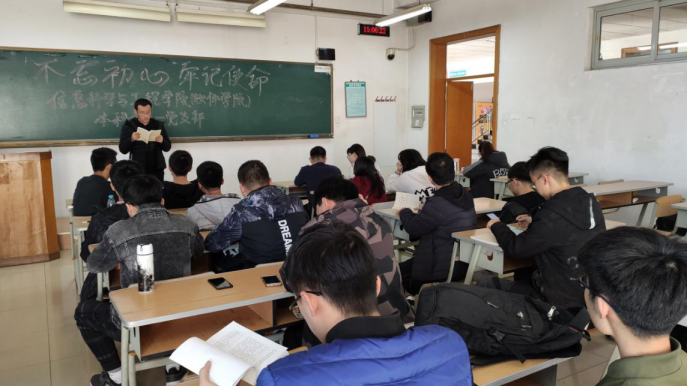 2019年11月7日下午,永利集团304am登录本科生第一党支部组织党员在(里)B107教室集体学习《习近平关于“不忘初心、牢记使命”论述摘编》第三专题。