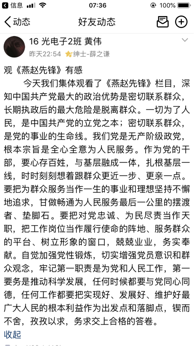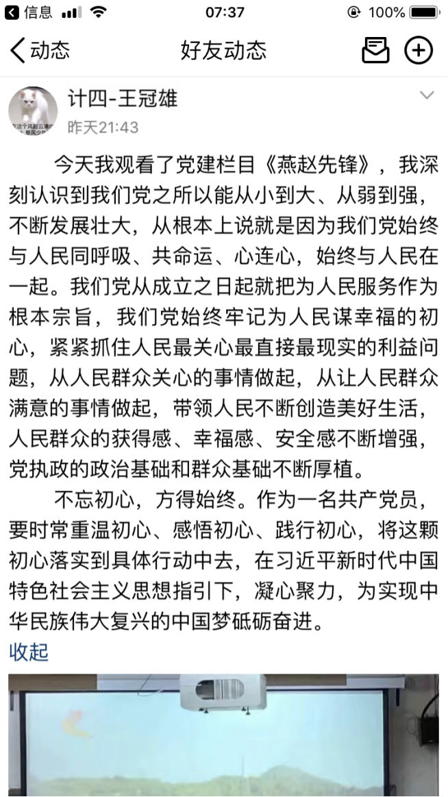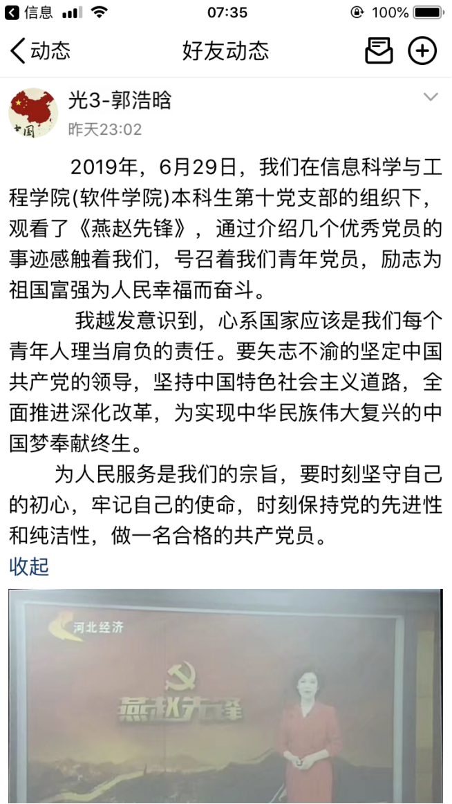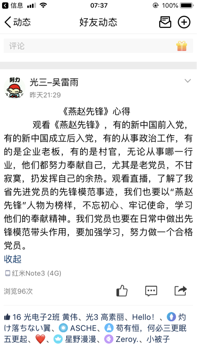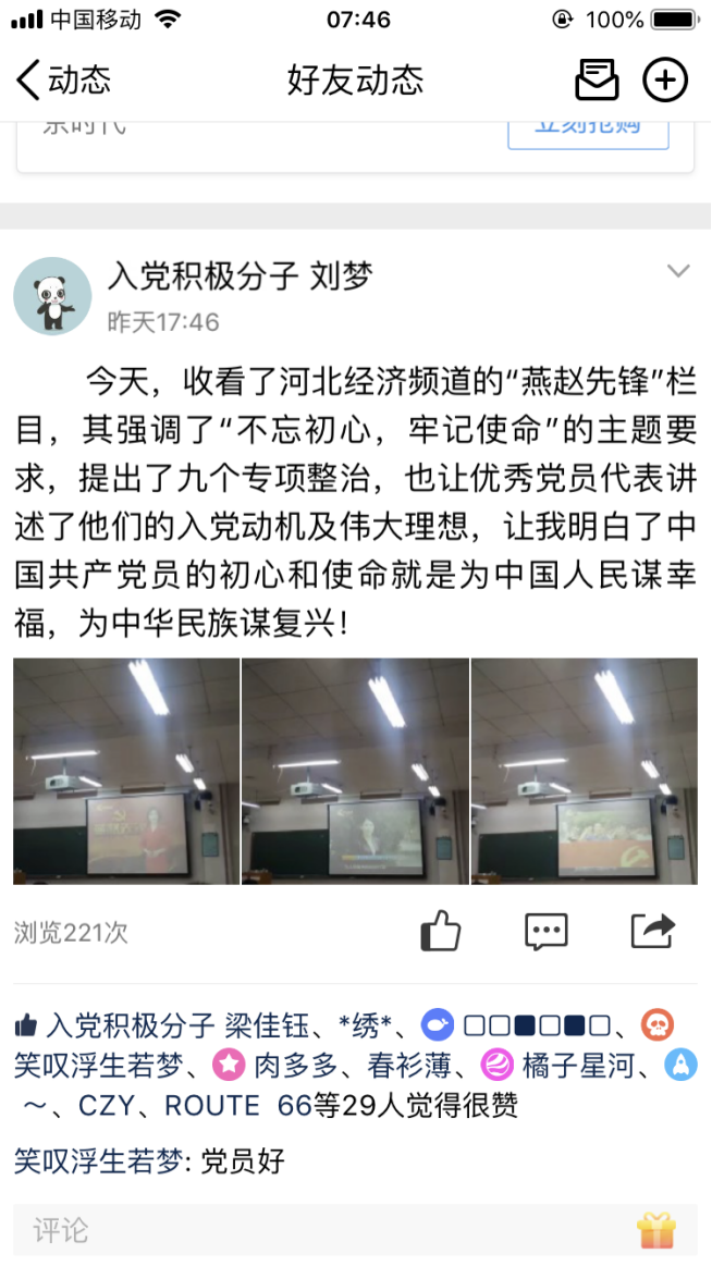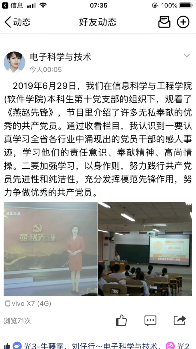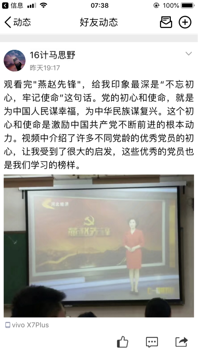 本次特别节目,充分展示了先进基层党组织和优秀共产党员的时代风采,观看完节目后,支部党员纷纷在QQ说说等新媒体上发表观后感,大家表示通过观看本次特别节目,深刻感受到“一名党员就是一面旗帜,一个党组织就是一个坚强的战斗堡垒”不是一句口号,而是共产党员用实际行动证明、用党性演绎、用生命谱写的,同时也接受了一次精神洗礼。通过学习收看,不仅学习了我省先进党员的先锋模范事迹,全体支部党员也要以“燕赵先锋”人物为榜样,不忘初心、牢记使命,学习他们的责任意识、奉献精神、高尚情操。作为老员工党员也要在实际生活学习中做出先锋模范作用,要加强学习,以身作则,努力践行共产党员先进性标准,做合格党员。