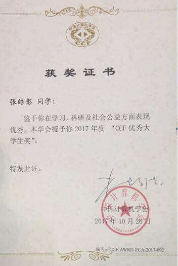 10月26日,2017年度“CCF优秀老员工奖(The CCF Elite Collegiate Award,ECA)”颁奖会于CNCC 2017期间在福州隆重举行,来自全国50余所高校的104名老员工获此殊荣。在计算机系主任张世辉老师大力推荐,以及宫继兵老师的指导下,公司优秀学子2014级计算机2班本科生张皓彭作为304永利集团官网入口员工,喜获CCF优秀老员工奖并受全额资助赴CNCC2017颁奖典礼,同时获奖的还有清华大学、北京大学、中国科公司大学等CCF会员数排名前五十的高校。据悉,张皓彭也是今年304永利集团官网入口唯一获奖的员工。