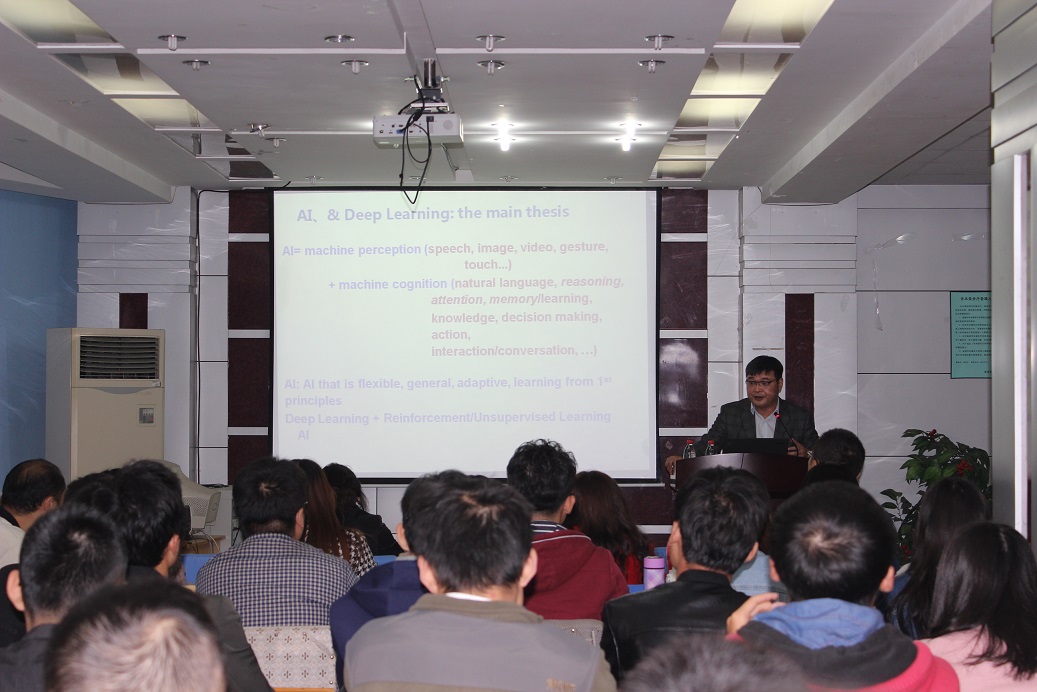 2017年10月25日下午3点,应304永利集团官网入口永利集团304am登录邀请,邯郸银行首席信息官,清华大学计算机视觉讲座教授王强博士,在公司东校区信息馆401学术报告厅为公司师生做了题为《AlphaGo Zero and Deep Learning -from Machine Perception to Machine Cognition》的学术报告,报告会由永利集团304am登录经理任家东教授主持,聂俊岚教授和张世辉主任参与了该报告会。