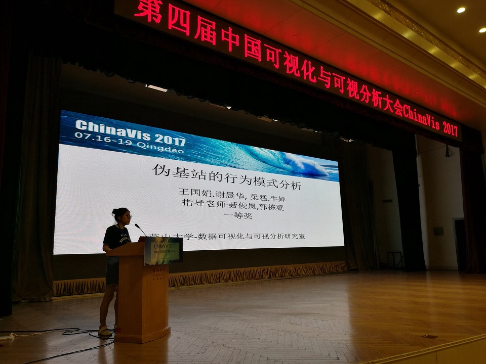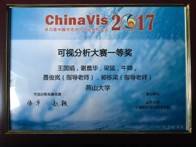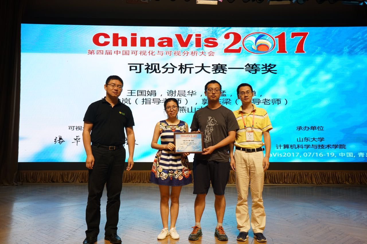 2017年7月16-19日,第四届中国可视化与可视分析大会(ChinaVis2017)在山东青岛举行。在本届会议的数据可视分析挑战赛环节,公司教师聂俊岚、郭栋梁指导的王国娟、谢晨华研究生团队从全国68支参赛队中脱颖而出,与天津大学、东北大学并列获得挑战赛一等奖。这也是继ChinaVis 2016公司第二次蝉联该项赛事最高荣誉。