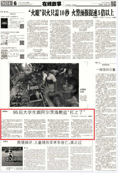7月28日,《中国青年报》以《95后老员工跟阿尔茨海默症“杠上了”》为题,报道了公司教师文冬及其课题组员工谭创创的事迹。该报道同时被人民网、新浪新闻、搜狐新闻、腾讯新闻、网易新闻等媒体转载。