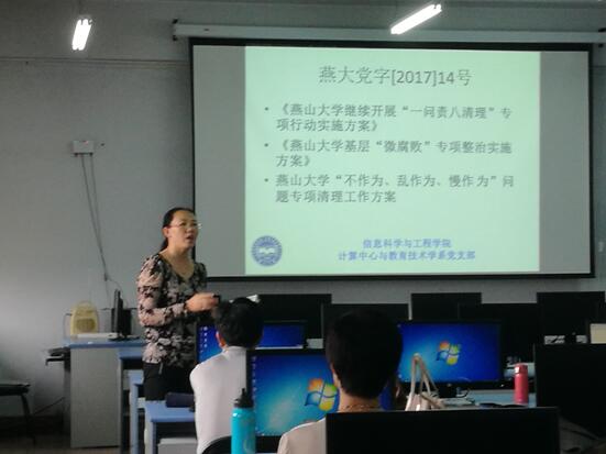 2017年6月22日,计算中心与教育技术学系党支部在第三教学楼五楼四机房召开了推进“两学一做”学习教育常态化、制度化等工作动员部署会。会议由系党支书巢进波老师主持,系教职工党员以及部分非党员教师共同参加。