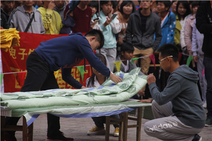 本次大赛由亮我彩衣,叠我军被两个环节组成。赛场上,参赛选手们争分夺秒,密切配合,一捏一折每一个步骤都利落而娴熟,通过细致认真的整理,转眼间就将一个个整齐的“豆腐块”展现在评委面前。比赛过程中,各班拉拉队手举独具班级特色的旗帜海报,为本班选手呐喊助威。奔腾艺术团尽心准备的各类文艺表演更是博得了在场同学的阵阵掌声,缓解了赛场的紧张气氛。整场比赛持续了三个多小时,气氛十分热烈,极大地促进了同学们之间的情感交流。