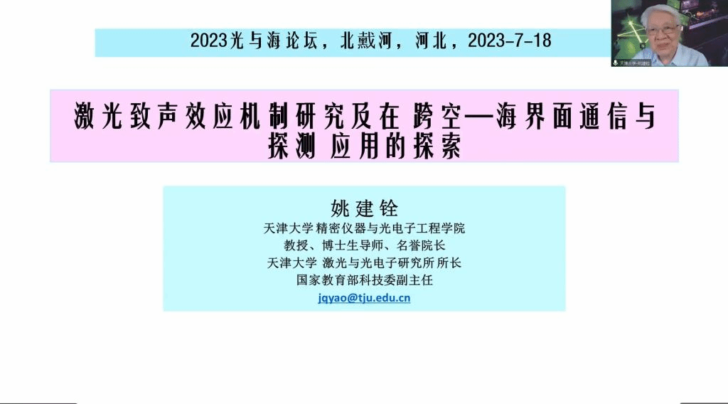 中国科公司院士、天津大学姚建铨教授做了“激光致声效应机制研究在跨空-海界面通信与探测应用的探索”的报告,为在场的各位同学与专家开拓了思路,了解了国家在相关项目上的需求。随后中国工程院院士、长春理工大学姜会林教授,做了“海洋光学测侦通一体化及新技术研究思考”报告,讲述了关于测侦通一体化的研究背景及国内外研究现状,重点说明了国家关于测侦通一体化技术的需求,鼓励海洋工作者与光学工作者,为国家发展做出科学家的贡献。最后,国际欧亚科公司孙松院士做了“海洋水母监测与治理技术需求与挑战”的报告,介绍了近些年来我国致灾水母数量剧增对核电站等战略设施造成的危害,分析了我国海洋水母监测的相关设备需求现状,为参会人员提供了研究思路。