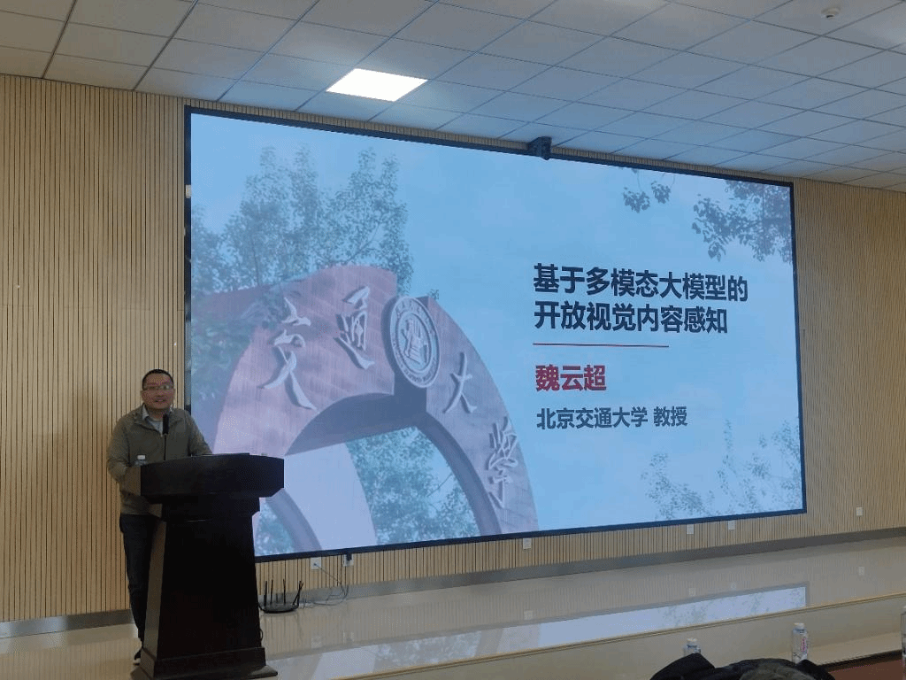 魏云超教授以《基于多模态大模型的开放视觉内容感知》为题,分享了其课题组利用多模态大模型在开放视觉内容感知研究方面的相关工作。这些工作着重解决了以下问题:1)如何利用多模态大模型将模型的语义分割能力从有限类别扩展到无限类别。2)如何将自然语言的复杂推理能力同语义分割任务结合,赋予模型在视觉感知任务上推理能力。