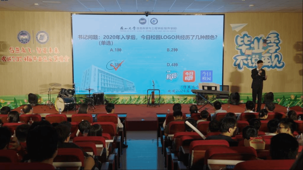 在第二篇章结尾,毕业生们追寻《燕园中留下的足迹》,再次进行有奖趣味答题互动环节,将晚会再次掀起高潮。题库以同学们学习生活中的点滴瞬间展开,让同学们在笑声中追忆了难忘的青葱岁月。