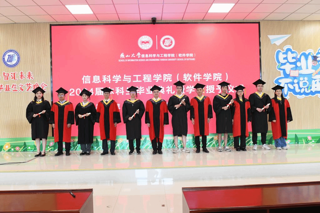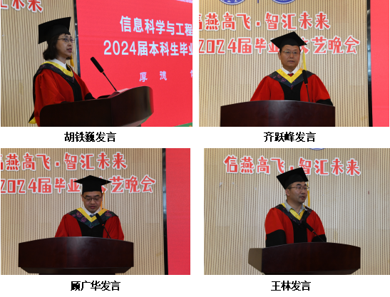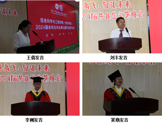 计算机科学与工程系王倩、光电子工程系刘丰、电子与通信工程系李刚、软件工程系窦燕作为教师代表发言。他们表达了对毕业生们的期许和祝福,希望同学们能够将燕大精神铭记在心,不负青春、不负韶华。