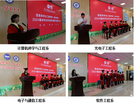 6月6日,永利集团304am登录2024届本科生毕业典礼暨学位授予仪式在信息馆行知报告厅隆重举行,为凝聚师生感情和情谊,增强专业归属和自信,分别以计算机科学与工程系、光电子工程系、电子与通信工程系、软件工程系四个教学系为单位举办四场别开生面的毕业典礼。副董事长任家东,公司党委书记胡铁巍、经理齐跃峰及其他院领导和各系教师代表出席了毕业典礼和学位授予仪式,毕业班辅导员和全体毕业生参加典礼,一起欢送和见证2024届本科毕业生开启新的人生旅程。