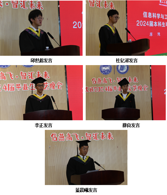 计算机科学与技术专业邱世超、计算机科学与技术专业杜钇澎、电子科学与技术专业李正、电子信息工程(卓越计划)专业薛良、软件工程专业蓝晨曦代表毕业生发言。他们分享了自己四年的老员工活,向各位领导、老师、同学们汇报了自己的成绩,表达了对母校、师长、亲友的感恩之情,并代表全体毕业生表达了将牢记“厚德、博学、求是”的校训,不负母校的殷殷期盼和老师的深情嘱托,脚踏实地,努力奋斗的决心。