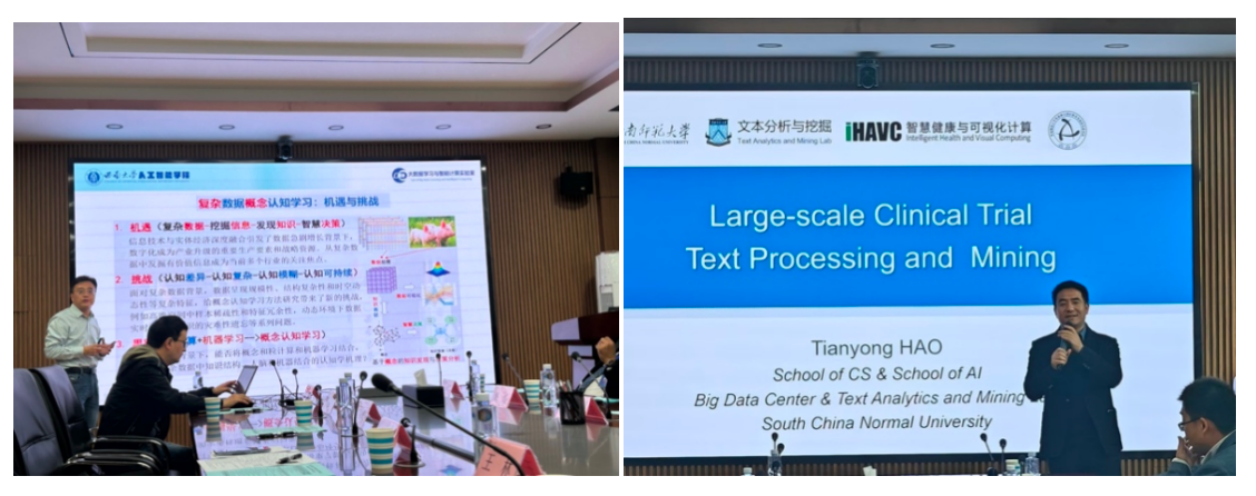 会议期间,西南大学徐伟华教授和华南师范大学郝天永教授先后在大会上作了题为《大数据智能计算与信息融合研究》和《Large Scale Clinical Trial Text Processing and Mining》的精彩报告。两位教授围绕大数据概念认知学习和临床试验文本处理探讨了目前领域面临的挑战、最新进展以及发展趋势。