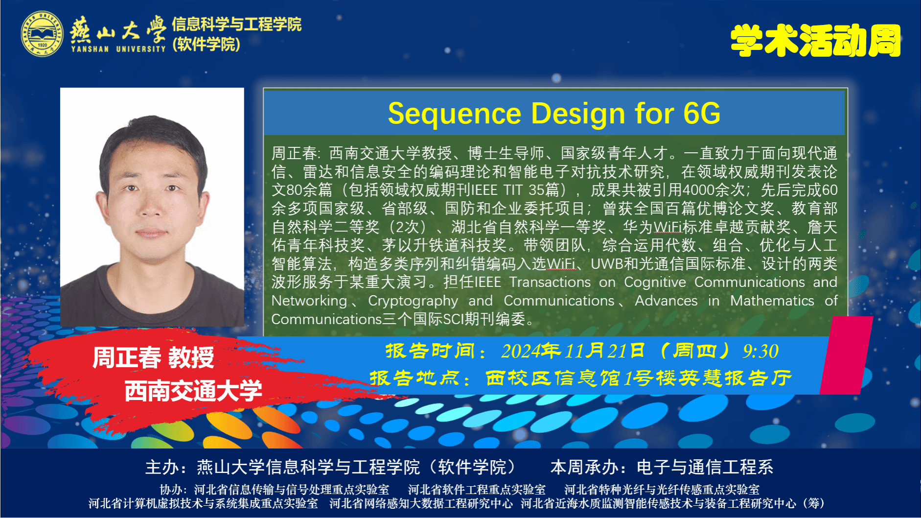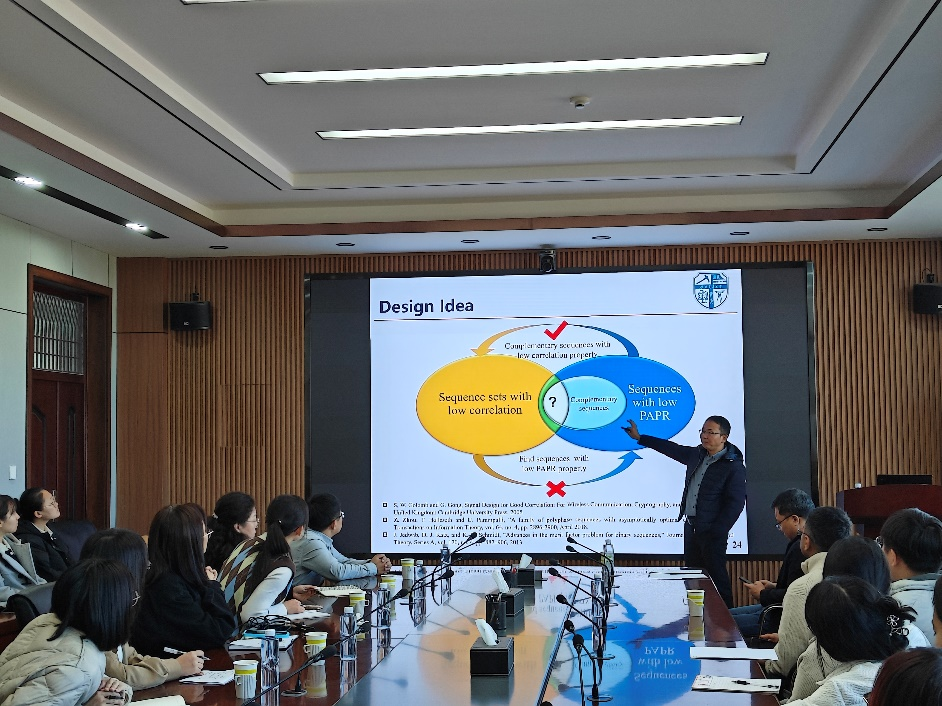 活动中,周正春教授首先介绍了团队的基本情况及主要研究方向。接着,周正春教授以《Sequence Design for 6G》为题,聚焦未来无线通信以及感知系统中的序列设计问题,探讨了6G中的序列设计标准,深入分析序列设计的数学机理,介绍了团队关于6G中具有低峰均功率比、大容量、低相关序列集构造方面的主要成果。