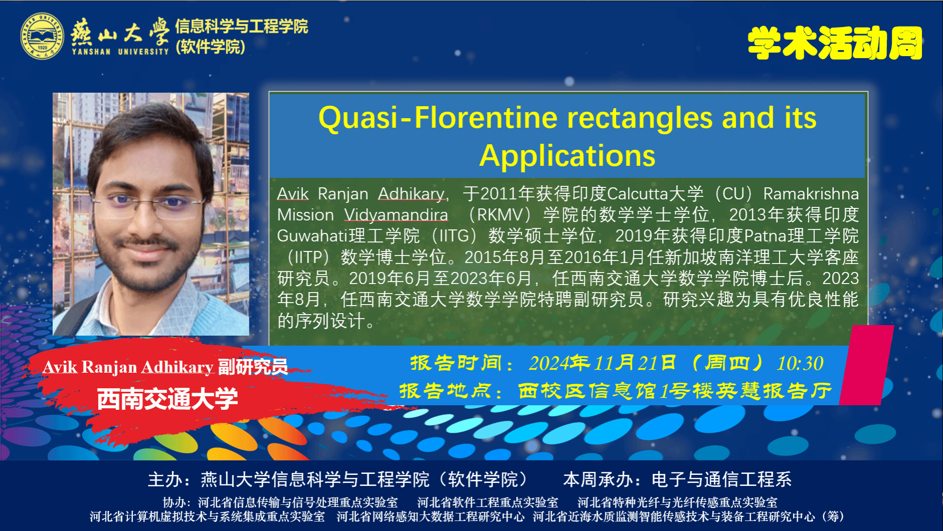 Avik Ranjan Adhikary副研究员以《Quasi-Florentine rectangles and its Applications》为题,聚焦无线通信中的低相关序列设计问题,提出了Quasi-Florentine rectangles的概念,介绍了其数学特性,给出了若干构造方法,并探讨了Quasi-Florentine rectangles在低相关序列设计中的应用。